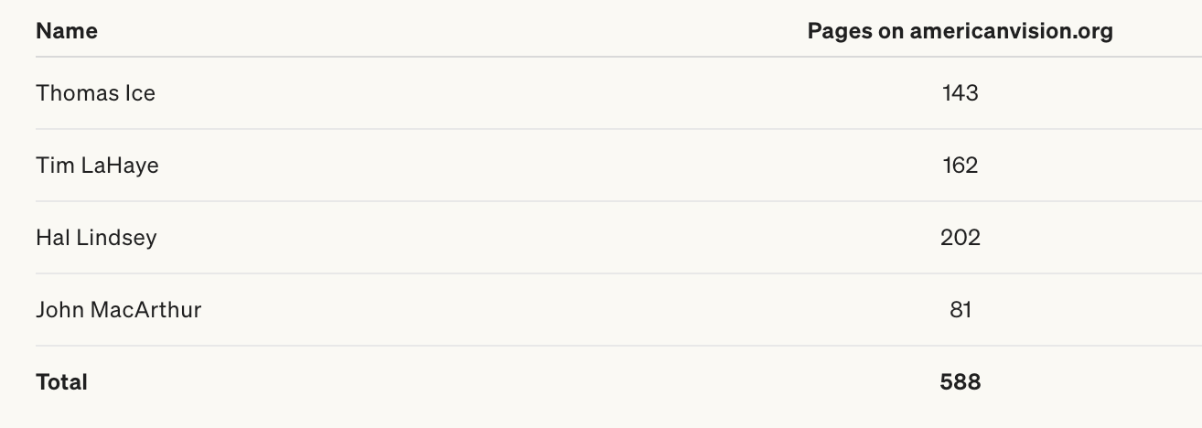 But I got curious. If I’m the one who supposedly can’t function without Gary DeMar as a topic of conversation, what does Gary’s own track record look like? So I ran the numbers. I ran a script to crawl both my site and americanvision.org to count how many pages mention specific individuals by name.